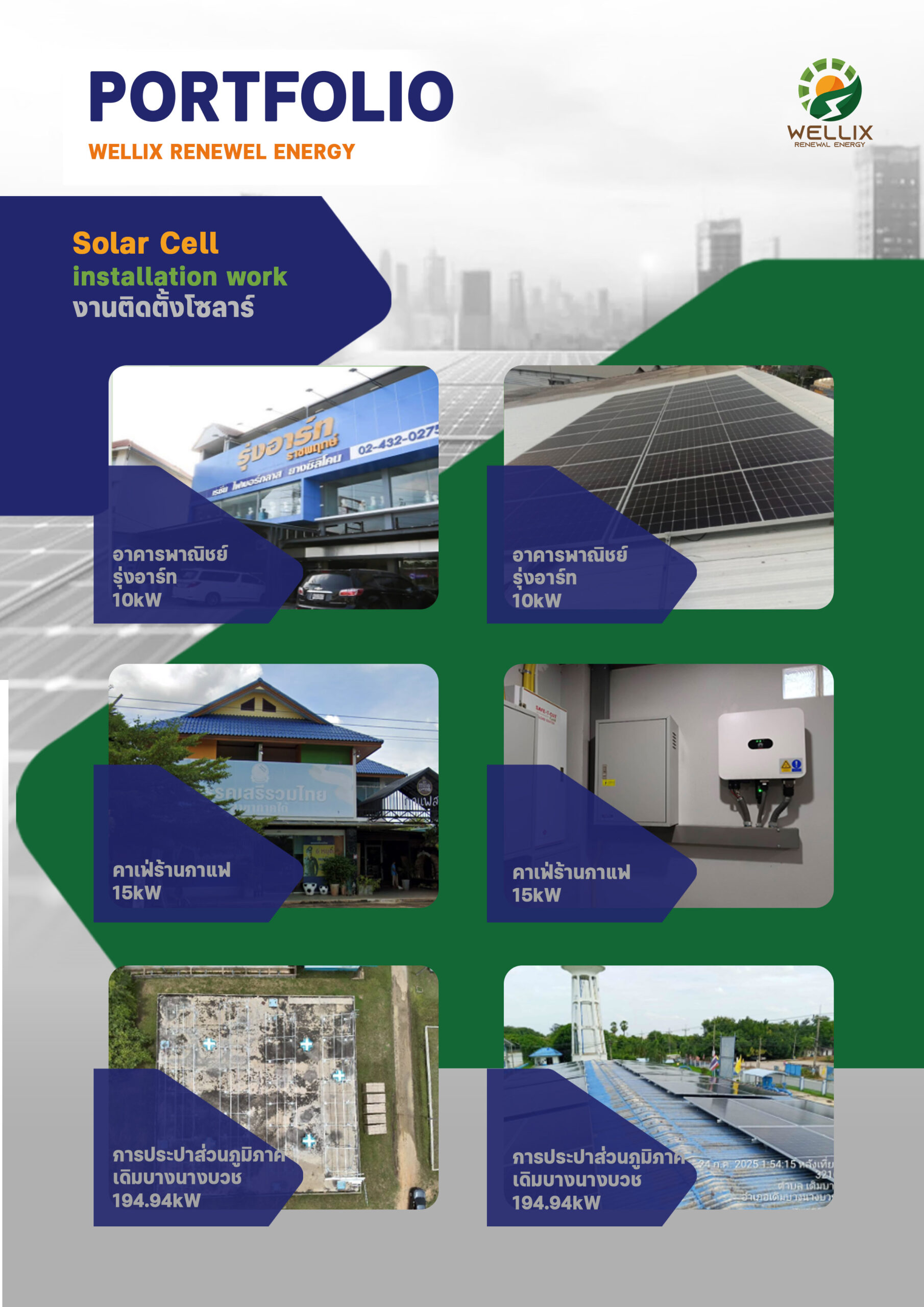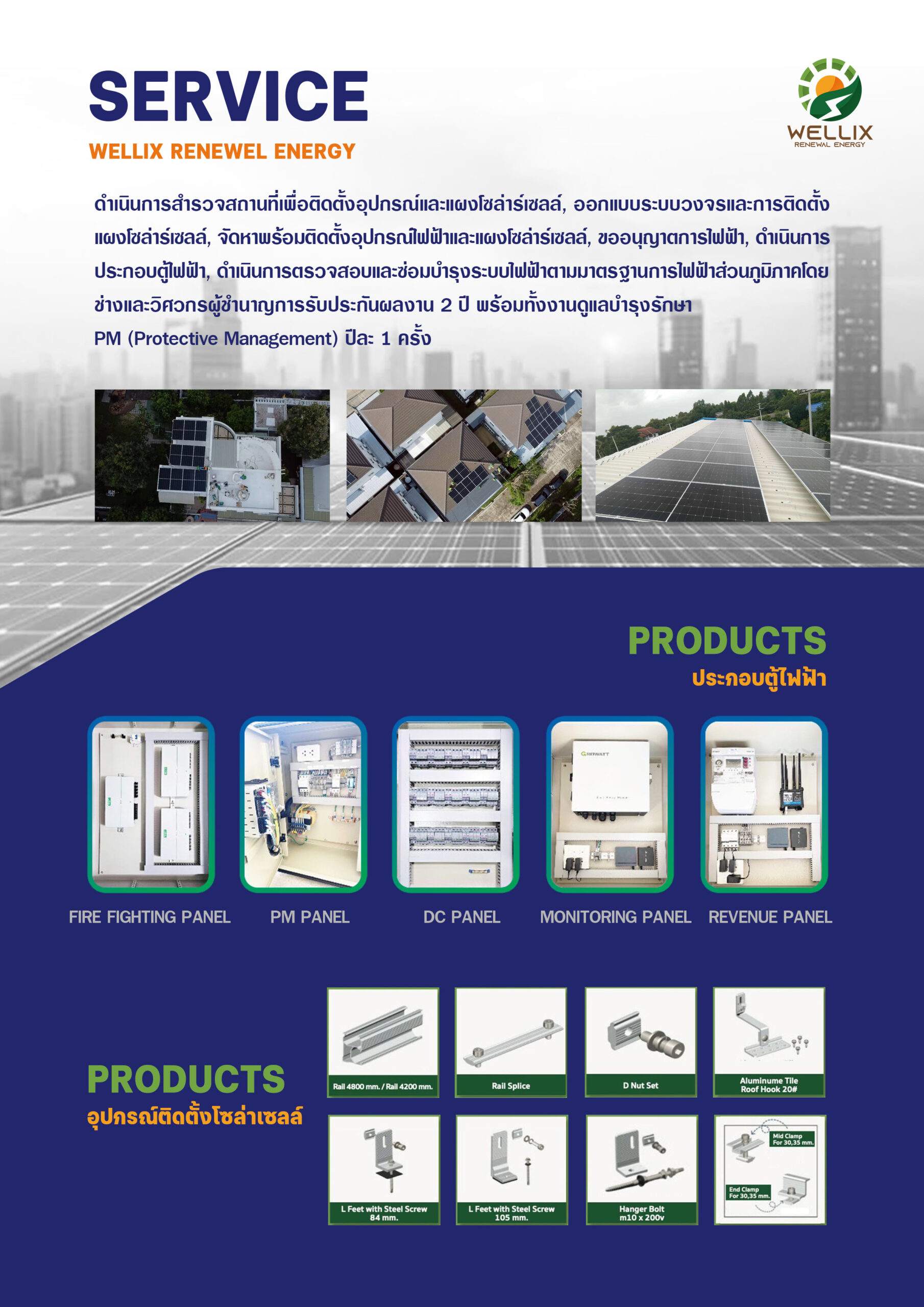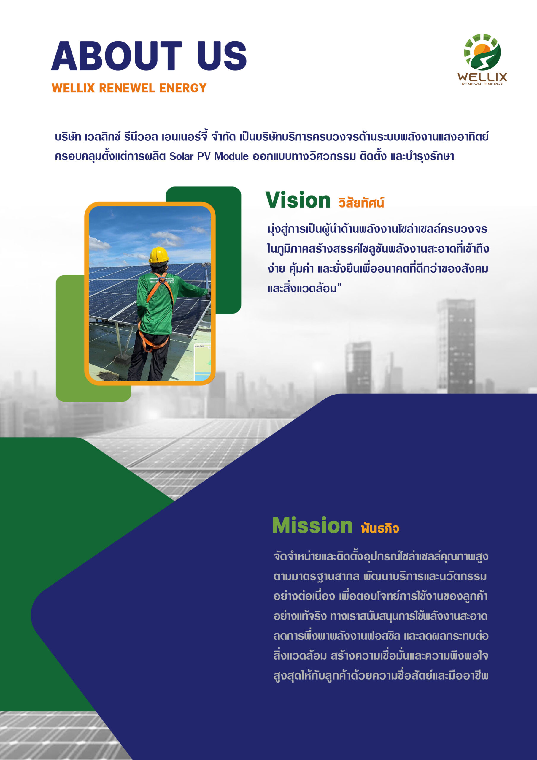 บริษัท เวลลิกซ์ รีนีวอล เอนเนอร์จี้ จำกัด เป็นบริษัทบริการครบวงจรด้านระบบพลังงานแสงอาทิตย์ ครอบคลุมตั้งแต่การผลิต Solar PV Module ออกแบบทางวิศวกรรม ติดตั้ง และบำรุงรักษา